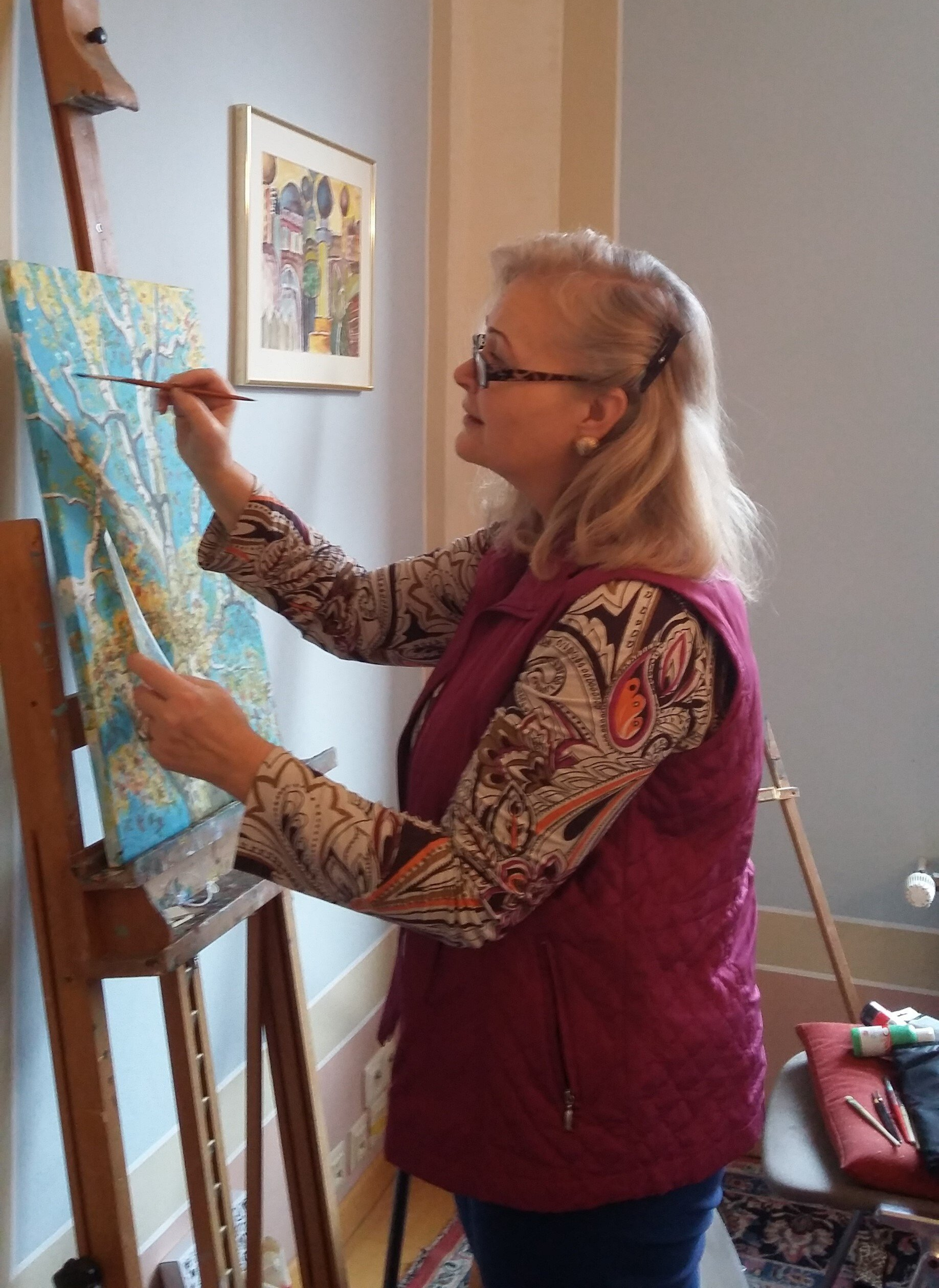 Hier arbeitet eine Frankfurter Künstlerin an der Staffelei, die schon als 4jährige ihre malerische Tätigkeit begann: sie verzierte die elterliche Wohnung mit farbenfrohen Zeichnungen auf Wänden, Möbeln, Fußböden und anderen ´"Malgründen". ....